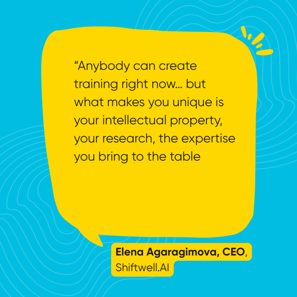 “Anybody can create a training right now… but what makes you unique is your intellectual property, your research, the expertise you bring to the table. Don’t be so quick to just outsource that part, because that’s the part AI cannot do yet.” — Elena Agaragimova