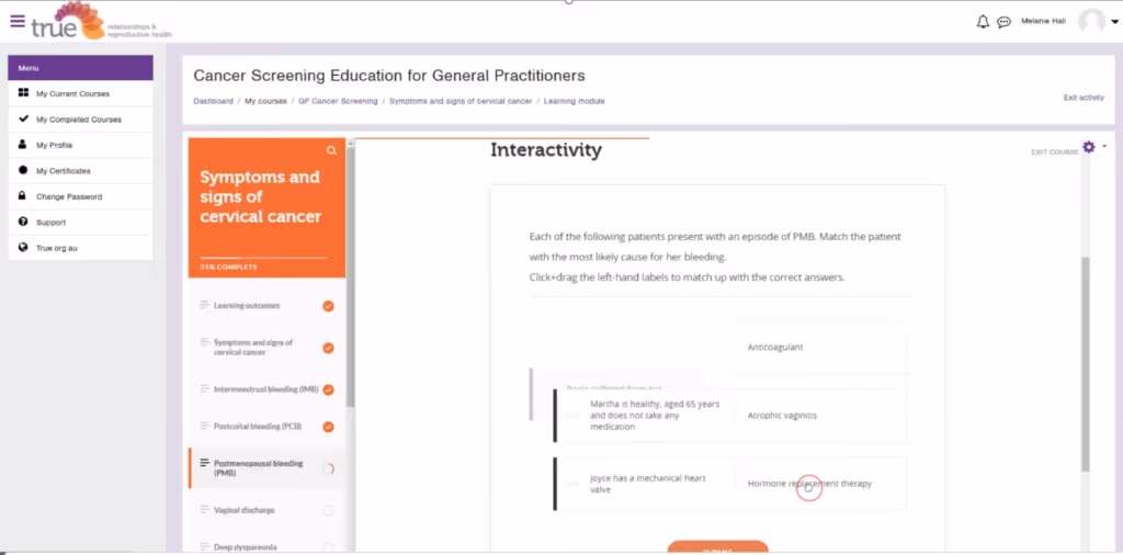 True’s Cancer Screening Education For General Practitioners is an example of an immersive blended learning course, with significant eLearning components complemented by short face-to-face or webinar. It is an eLearning-based course composed of podcasts, surveys, quizzes and online evaluations, complemented by a short 30min face-to-face or webinar session.