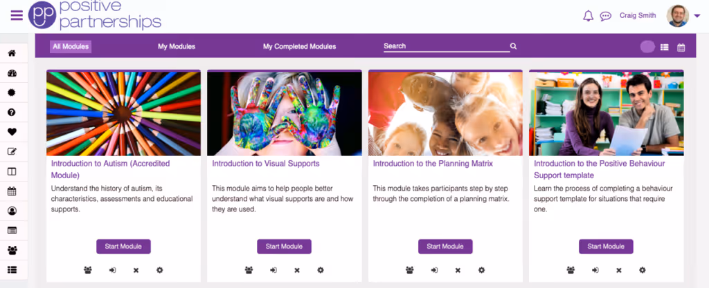 Positive Partnership’s 2-Day Parent/Teacher Workshop is an example of a moderate blended learning course, with an even mix of face-to-face or webinar with eLearning. The course is an equal combination of face-to-face/live online, SCORM modules and quizzes.