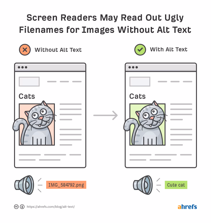 For example, instead of using "image1.jpg" as the alt text, use a descriptive phrase like "Photo of a sunset over the ocean" to provide context for users who cannot see the image. The image below from Ahrefs highlights the point perfectly: