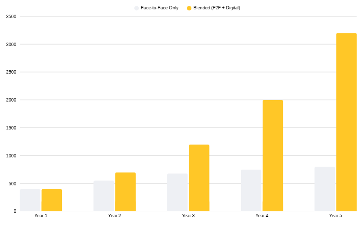 By year five, the difference wasn’t incremental. Blended generated 4x the revenue of face-to-face alone.